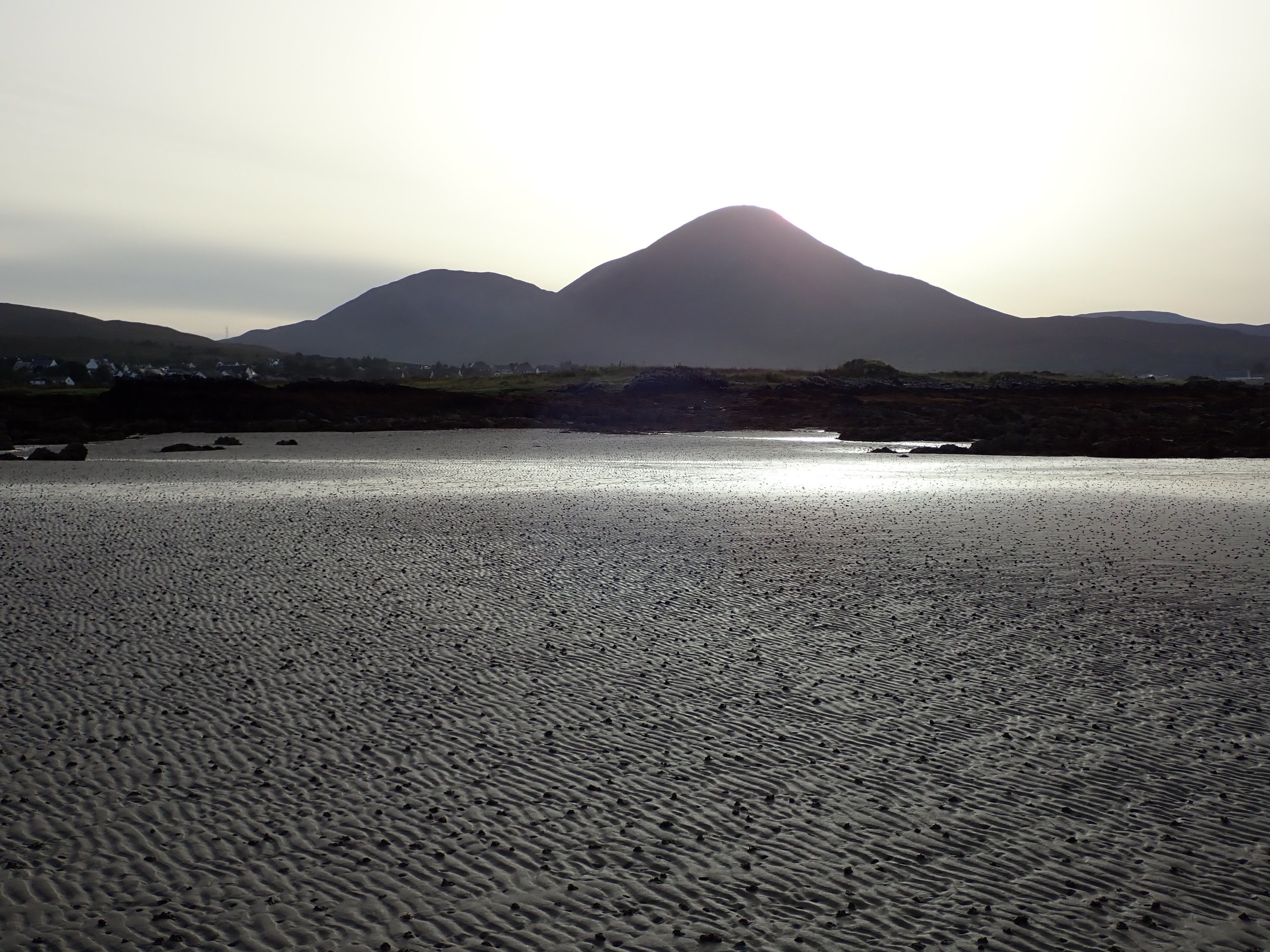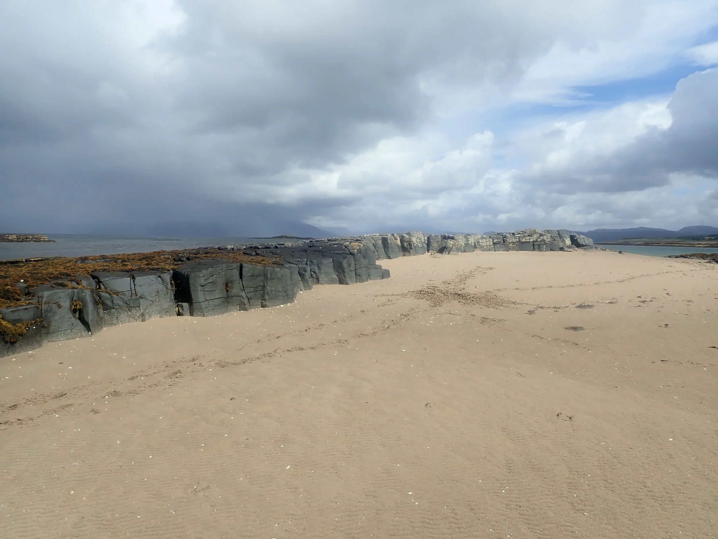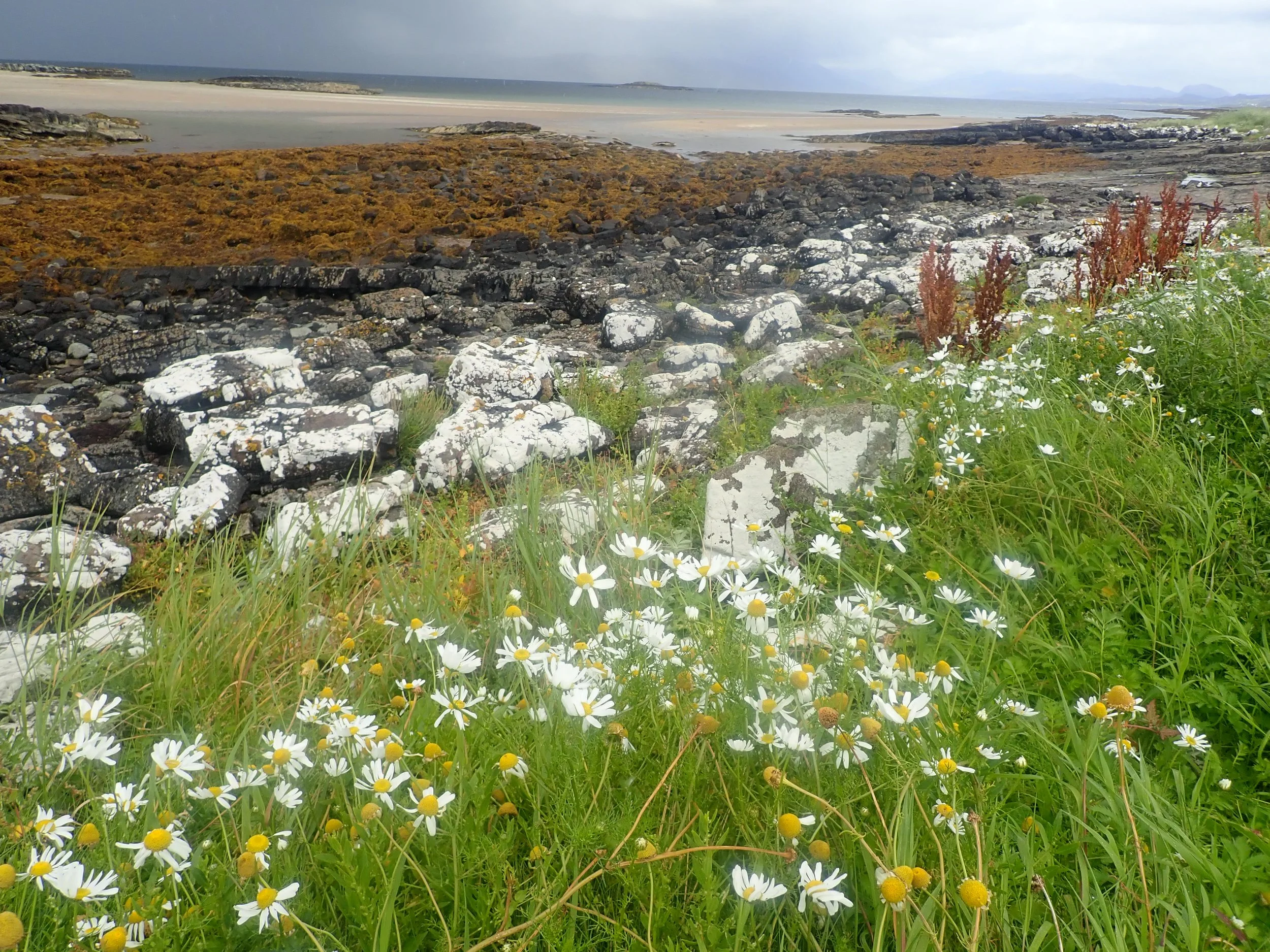 From the main road just past Broadford on the A87, turn into the small winding road toward Lower Breakish until you arrive at a graveyard which is associated with Saint Maelrubha the irish saint. Nearby is the sacred well of Tobar Ashik. A track to the shore leads down to the gate to the beach.. At low tide you can walk out across the shoreline to a wide sandy beach further out. Look out for the coastal flowers, variety of different seaweeds and intricate patterned rocks of Bassalt Quartz. If you are lucky you may even see a seal and always an abundance of seabirds, enjoy this open expanse of this coastal terrain. This magnificant beach can only be reached at low tides. The river runs into the beach here so take care if there has been lots of rain, as at these times the river can swell making it difficult to cross. Looking straight out to sea on the horizon is Pabay Island, the name comes from the Norse word ‘Papey’ meaning Preists Island and suggests a spiritual history.